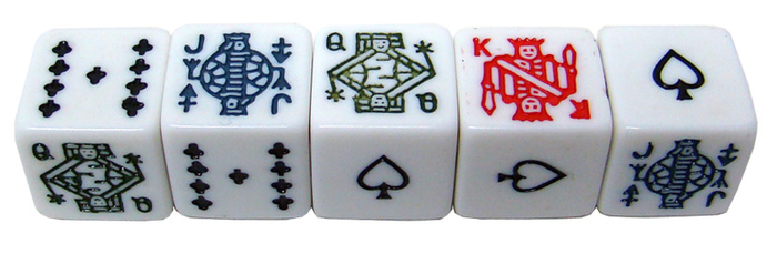 Это кубики для игры в покер. На каждом кубике вместо точек изображены карты от 9-ки до туза. Игроки бросают кости по очереди стараясь выкинуть редкую комбинацию (стрит, 2+2, тройку, фулхаус) или чем больше совпадений одной и той же карты, на формирование комбинации у каждого есть по 3 попытки. Если с первого броска выпали несколько хороших костей, можете их оставить, а остальные перекинуть один или если не получите то что хотели, 2 раза.