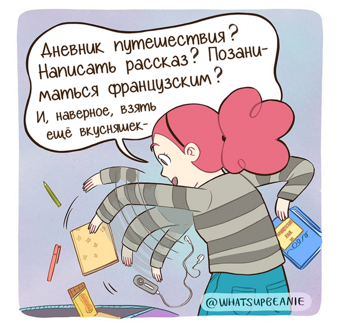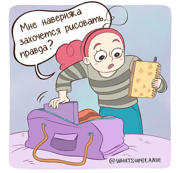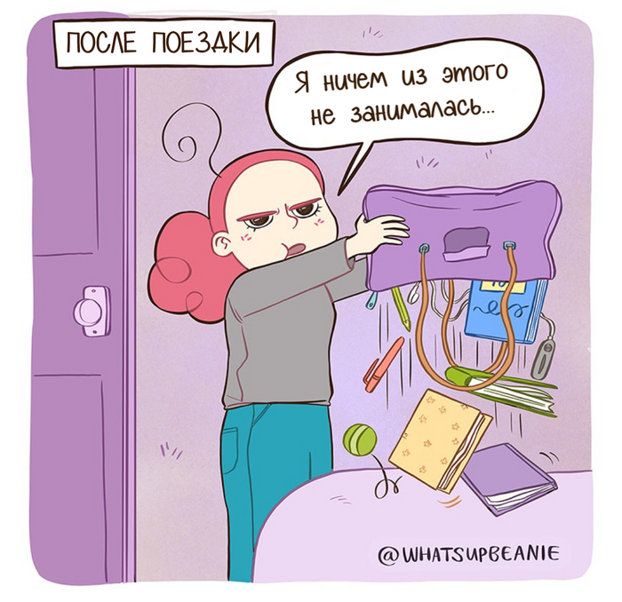 Комментарий автора: Вы когда-нибудь собирали полную сумку вещей, чтобы было, чем заняться, а потом ничего из этого не пригодилось? Я думаю, плюсом является то, что это означает, что поездка была интересной, раз ничего не понадобилось. Но вам все равно приходится таскать все эти вещи в сумке, ха-ха.