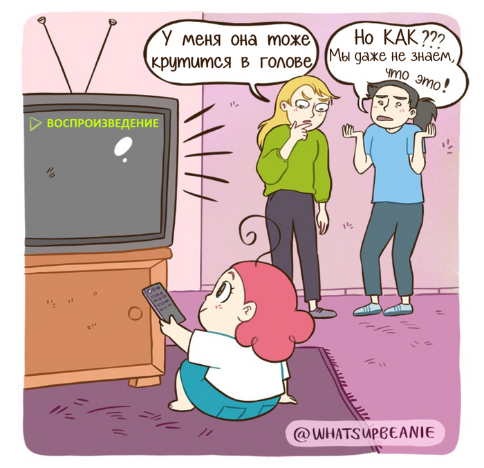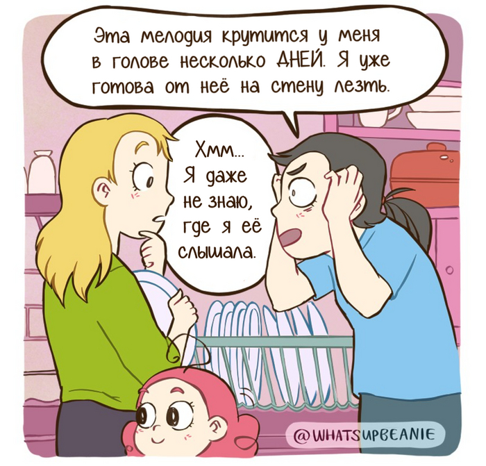 Комментарий автора: А у вас есть мелодия или песня, которая КАЖДЫЙ РАЗ застревает в вашей голове? В детстве я смотрела много мультиков, поэтому у всех в моей семье в головах крутилась музыка из мультфильмов.