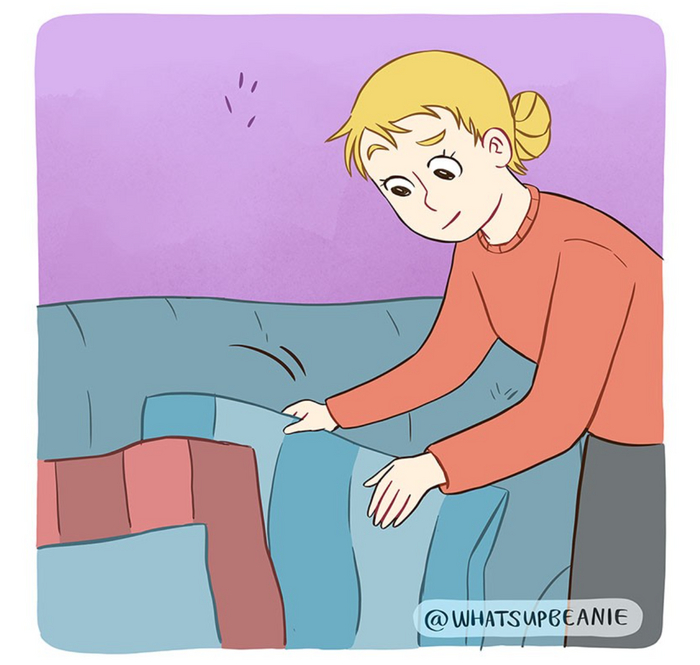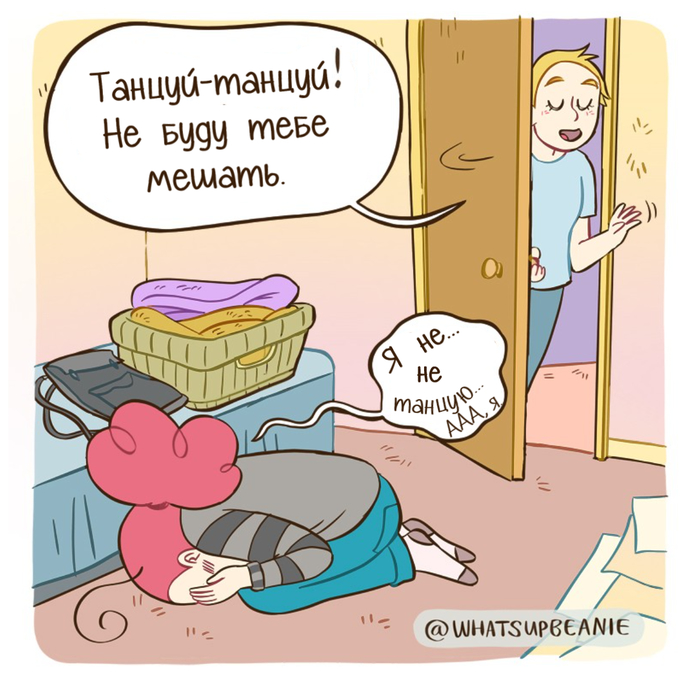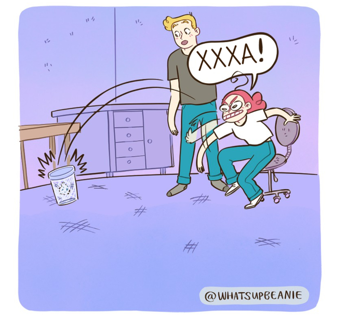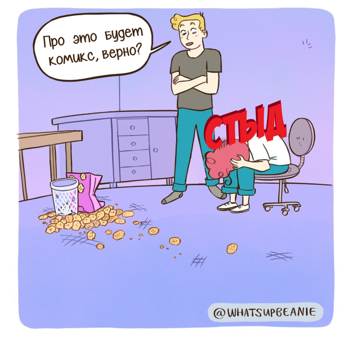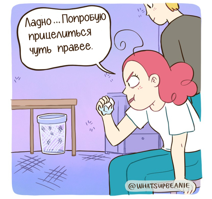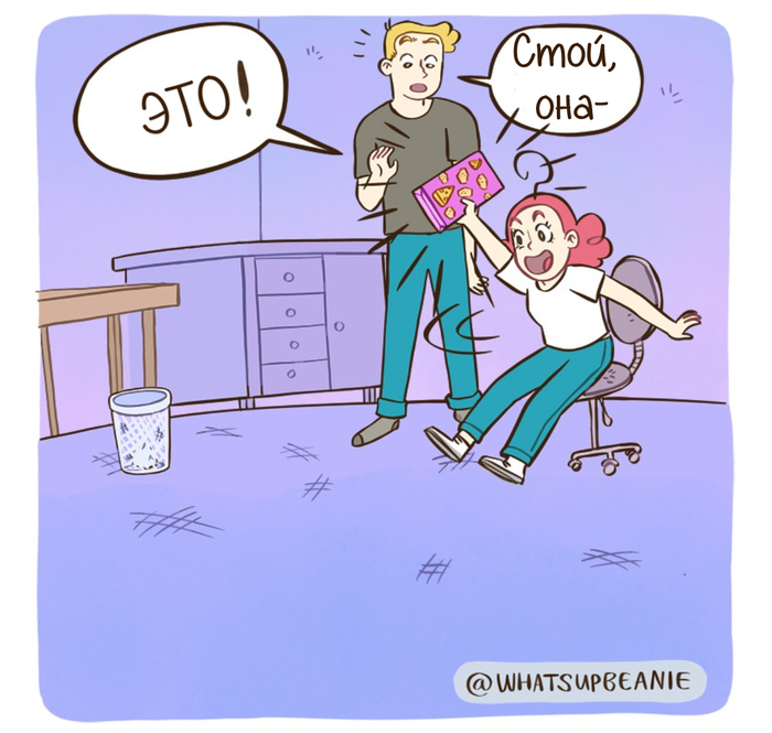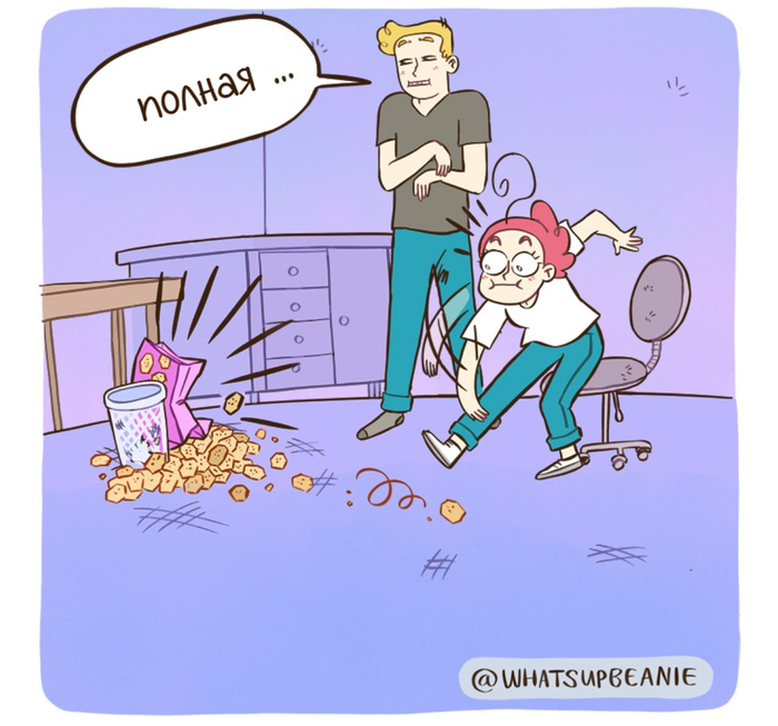 Комментарий автора: А кто-нибудь из вас когда-нибудь превращал выбрасывание мусора в проблему? Мне было так стыдно. Коробка с крекерами лопнула с громким звуком, когда ударилась о край мусорной корзины, а крекеры разлетелись повсюду. Добрые 10 секунд мы просто молча смотели на всё это.