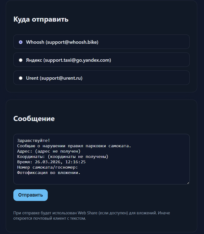 Интернет‑приложение для составления жалобы на парковку самокатов. Автоматически подцепляет адрес и время из фото, нужно только ввести номер самоката