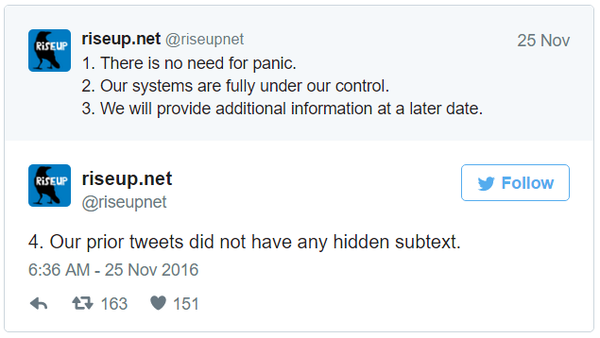 Свидетельство канарейки RiseUp должно обновляться «приблизительно раз в квартал.» Последнее обновление было 16 августа 2016 – почти две недели после последнего трехмесячного срока. Некоторые пользователи заметили, что канарейка RiseUp скорее мертва, чем жива, и что-то не так. Пользователи так же отметили, что некоторые из последних твитов RiseUp содержат скрытые послания, как этот скриншот со страницы RiseUp о политике коллектива, где он обещает отключить сервис прежде, чем подчиниться «репрессивной слежке на какое-бы то ни было правительство»: >твит>