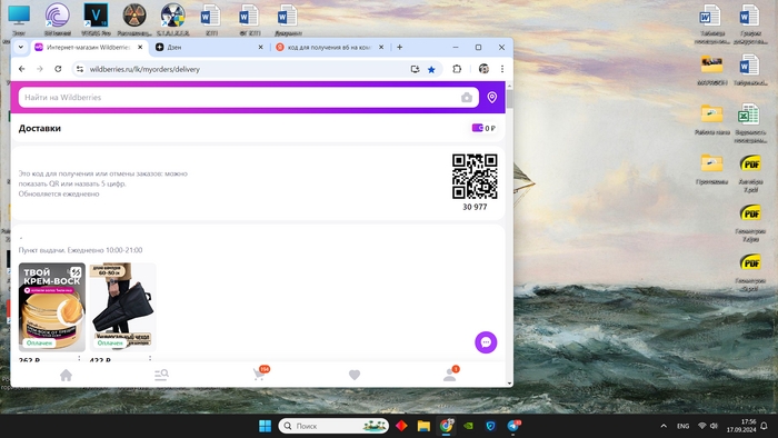 Вот так выглядит страница доставок в версии для компьютера. Код получения есть, а qr-кода нет!