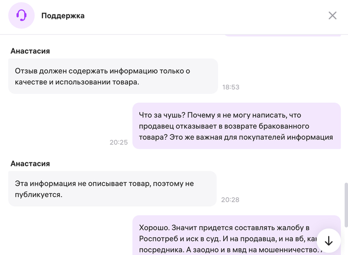 Во-первых, поддержке ВБ категорически всё равно на ваши обращения. Такие недобросовестные продавцы чувствуют свою полнейшую безнаказанность на площадке и позволяют себе даже язвить покупателям, которым из-за несправедливых правил приходится выкупать товар.