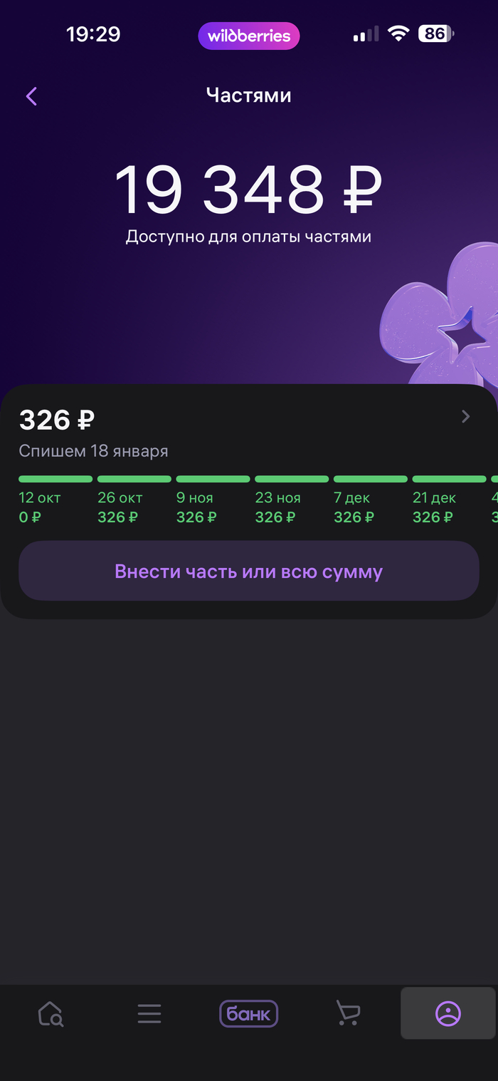 Неуважаемый Вайлдберрис, это просто наглость и мошенничество с вашей стороны, или сбой при обновлении приложения? Потому что произошло это именно после обновления. Сегодня, 17 октября, я оплатила эти 6 платежей по 326 руб = 1956 руб. Остаток 130 руб спишите со счета wb сами. Получится стоимость кофты 2086 р.