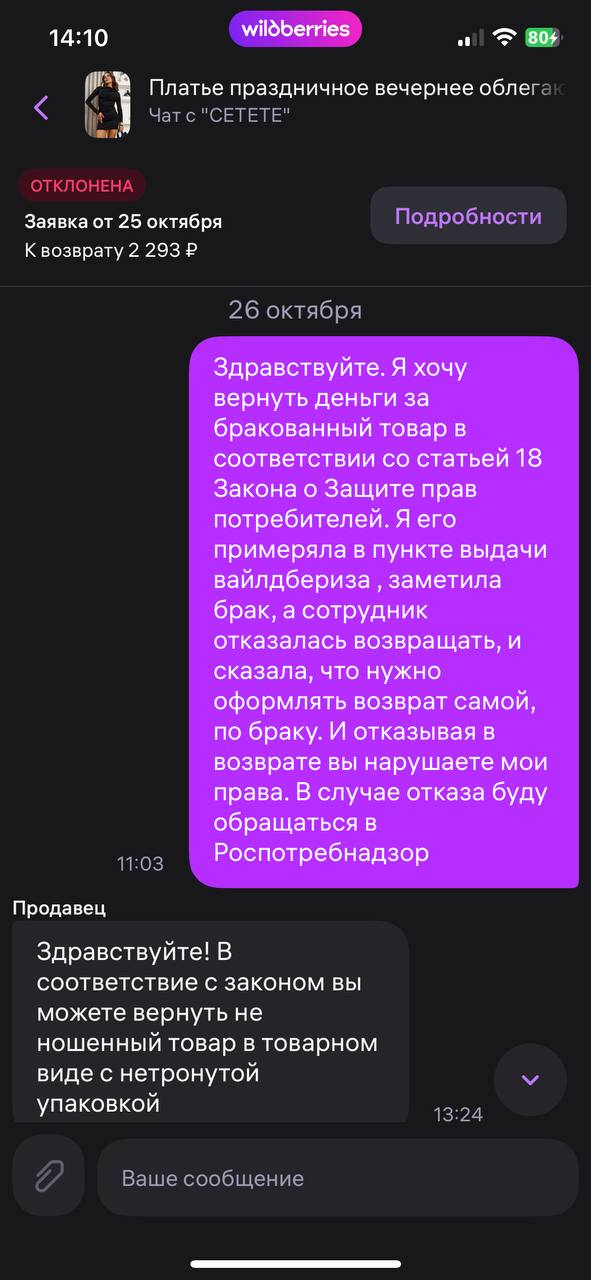 На какой закон данная "ягодка" ссылается? С чего она взяла, что товар ношенный, если на нем есть все бирки и примерила она его в пункте выдачи - не понятно. А как можно убедиться в качестве товара и оставить при этом непрозрачную упаковку нетронутой - загадка, так сказать, от Жака Фреско. На размышление 5 секунд. Дальше она САМА попросила обратиться в Роспотребнадзор, видимо, ощущая свою безнаказанность и вседозволенность на данной площадке. А потом и вовсе выставила мою жену виноватой в ситуации. Что она, якобы неправильно подобрала размер из-за чего и сама порвала платье.