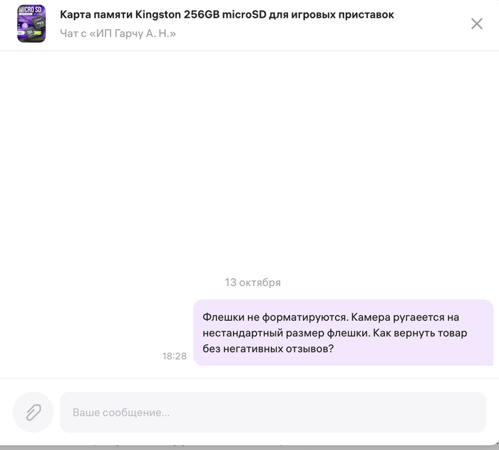Пишу продавцу по всем контактам в телеге и вацапе, которые он приложил к товару. Сутки - молчание. Ок. Пишу продавьцу в чат маркетплейса: