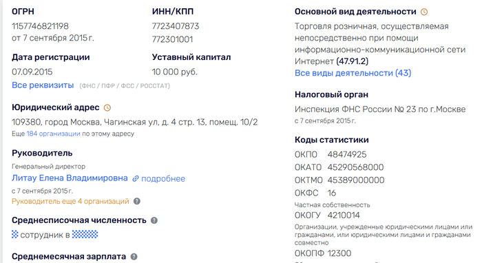 Почему я говорю она? Ну чтож, в ходе небольших манипуляций в виде печатания текста в гугл, оказалось легко найти ФИО учредителя фирмы Рога и копыта ООО "Резорт Фэшн Груп", что является юридическим названием продавца СЕТЕТЕ.