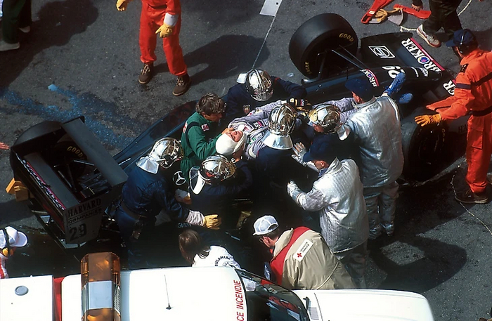 Казалось, что жестокие боги напоминали спорту, на что они способны, если захотят, и в некоторых местах пресс-центра, откуда открывается вид на место происшествия, было что-то неприятно близкое к истерике, когда люди смотрели вниз на искорёженный «Симтек». Ситуация казалась похожей на инцидент с Ратценбергером в Имоле, тем более что Монтермини заменил его в команде.