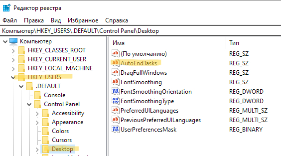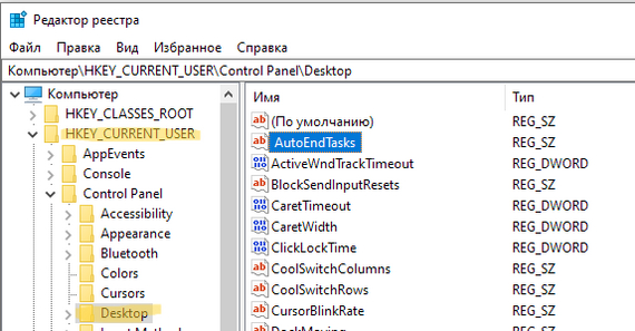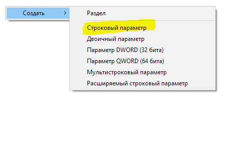 5. Справа а окне появится набор параметров, нужно нажать правой кнопкой мыши на пустой области и выбрать в появившемся окне "создать>строковый параметр". Задать параметру имя без кавычек "AutoEndTasks". Убедитесь в том, что созданный параметр имеет тип REG_SZ