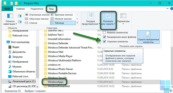 Запускаем Windows 10, открываем видимость скрытых папок.