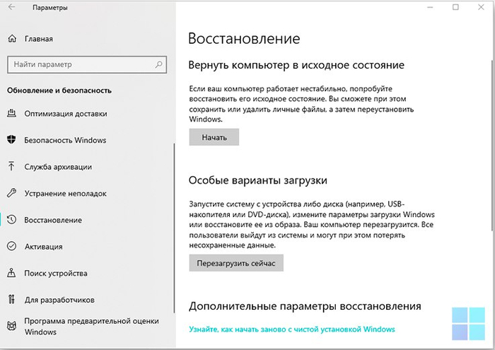 Если Microsoft Store ни с того ни с чего начал работать неадекватно, это может быть следствием работы вирусов. Встроенные средства Виндоус могут восстановить систему до того момента, когда Магазин работал нормально. Раздел восстановления находится в «Параметрах»/«Обновление и безопасность».