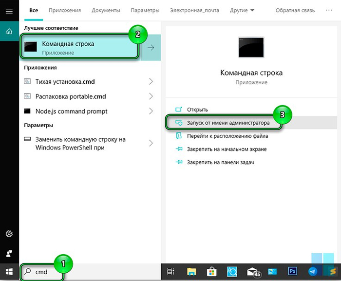 Запускаем консоль командной строки с правами администратора. В поиске Windows пишем cmd и в результатах выдачи выбираем соответствующий пункт.
