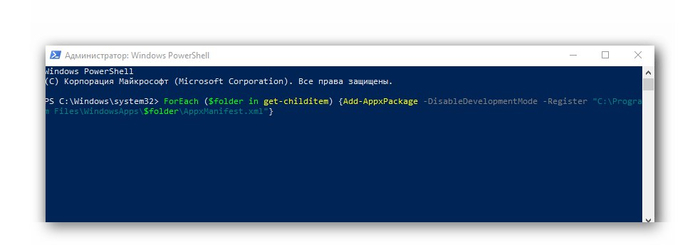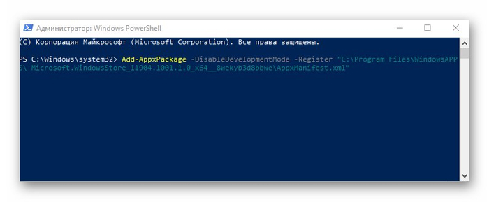 В код вставляем значение со своего компьютера. (В коде ниже вставлено значение из моего).Add-AppxPackage -DisableDevelopmentMode -Register «C:\Program Files\WindowsAPPS\ Microsoft.WindowsStore_11904.1001.1.0_x64__8wekyb3d8bbwe\AppxManifest.xml»