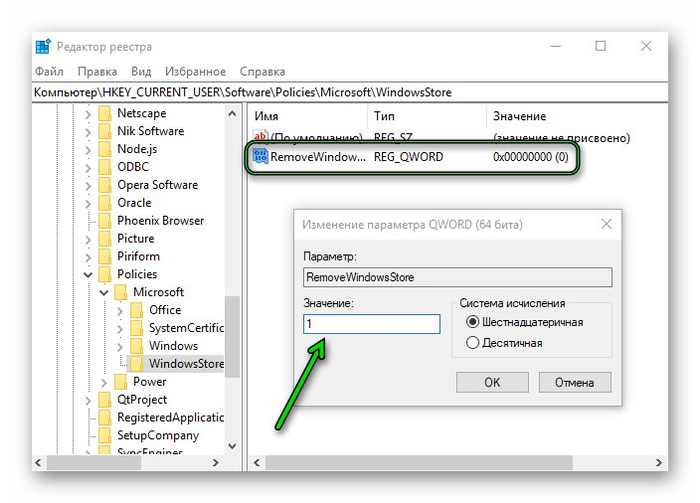 Называем его Remove Windows Store — меняем значение параметра с 0 на 1.