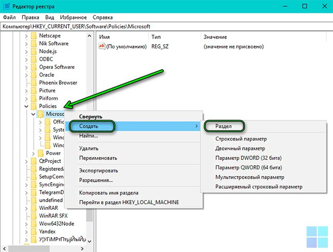 Выполняем правый клик мышкой на вновь созданном разделе и выбираем «Создать» / «Параметр DWORD (64 бита)» (если у вас 32-разрядная система, то выбираем соответствующий параметр).