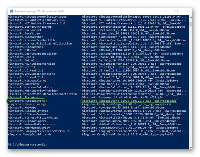 Откроется список приложений Windows. Находим здесь Microsoft.WindowsStore. Из правой колонки нам нужно скопировать значение. В моем случае команда ниже. У вас, в зависимости от версии Windows, цифры после названия могут отличаться. Microsoft.WindowsStore_11904.1001.1.0_x64__8wekyb3d8bbwe