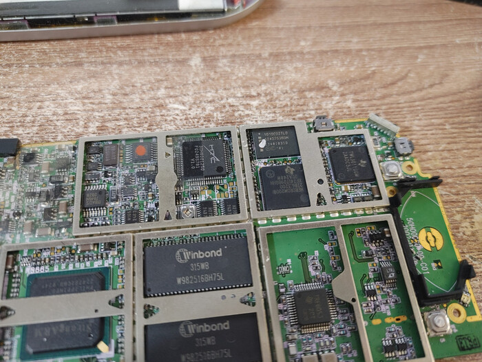 Рядом с процессором находится две «банки» оперативной памяти типа SDRAM общим объемом 64Мб, а также чип TRF6053 от Texas Instruments — предположительно, RF-фронтэнд или трансивер.