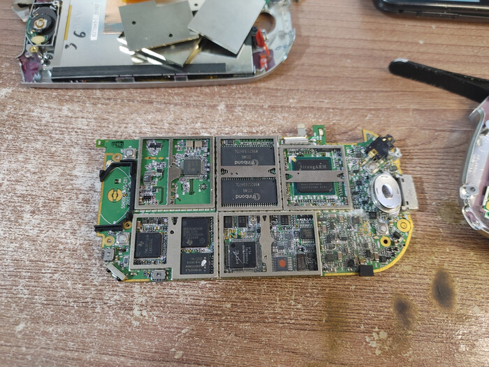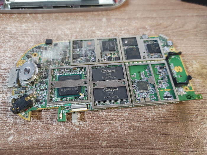 С обратной стороны платы расположились два чипа NOR памяти по технологии StrataFlash от Intel общим объёмом в 64Мб, контроллер дисплея от Sony, остальные части GSM-радиотракта и большое количество самых разных маленьких чипов для логики!