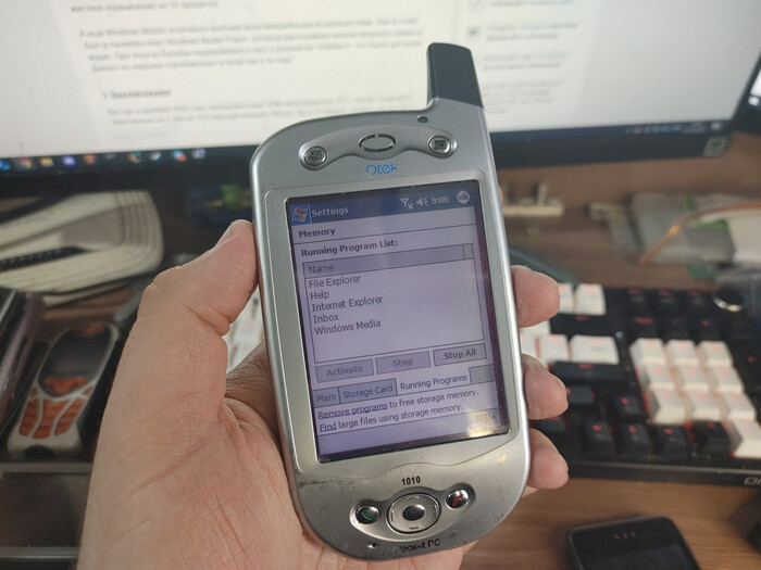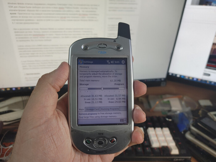Сейчас объём ОЗУ в 64Мб кажется смешным, но в те годы его более чем хватало! Даже на бюджетном коммуникаторе можно было одновременно запустить с десяток программ и все они работали параллельно и система не выгружала их сама. Никаких "скриншотов" в диспетчере задач как на iOS и Android! Но был и нюанс: в ранних версиях WinCE было жесткое ограничение на 32 процесса.