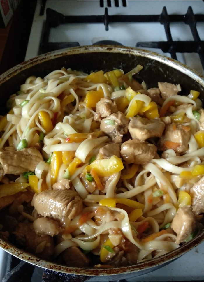 Все процессы показаны на видео, только одно уточнение: варите лапшу 15сек, потом в холодную воду, чтобы смыть лишний крахмал; слейте воду и добавьте масло, чтобы лапша не слиплась, пока Вы готовите остальное.