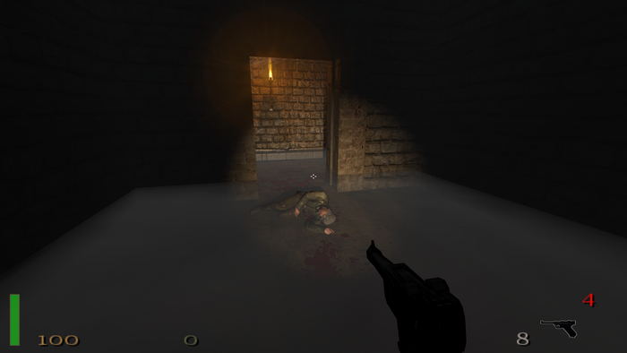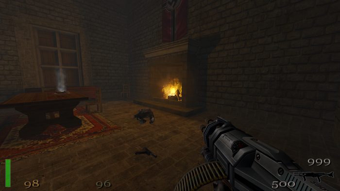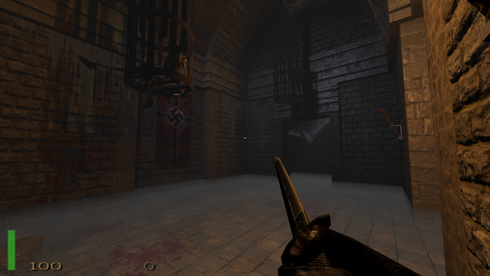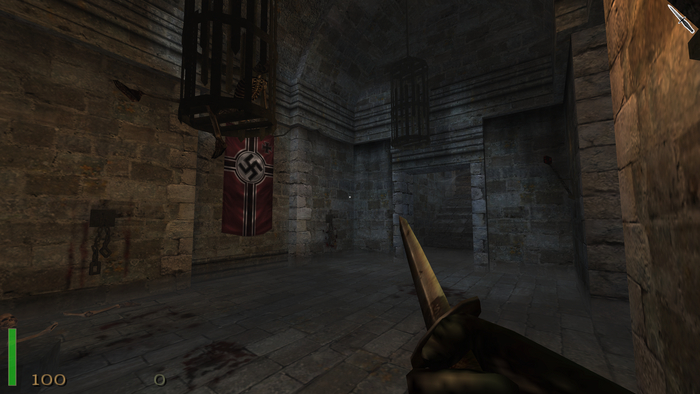 Снизу обновленный вариант - v1.42c, порт Berserker@WolfSP 20190525, 4x upscale оригинальные текстуры NPC и оружия из мода wpK, текстуры окружения и предметов из Reborn to Castle Wolfenstein, разрешение 3840x2160, все настройки на max