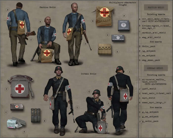 Так как моя задача состоит в сохранении более "ванильного" стиля RTCW, то я решил использовать из Reborn to Castle Wolfenstein только некоторые наработки. Мне очень понравились текстуры окружения, предметов и текстуры одежды NPC из мода. Они неплохо вписываются в игру и, к тому же, имеют уже готовые текстурные слои. От новых моделей NPC, монстров, оружия, новой музыки, звуков, меню и т.д. я решил отказаться. В качестве текстурной основы для оружия я выбрал мод wpK, это простой и качественный ретекстур оригинального вооружения (только текстуру Sten взял из RTCW Venom Mod). Я апскейлил текстуры оружия в 4х, сгенерировал и отредактировал карты нормалей для них. Я решил использовать оригинальные текстуры лиц NPC и текстуры всех монстров, просто так же апскейлил их в 4х и сгенерировал карты нормалей.
