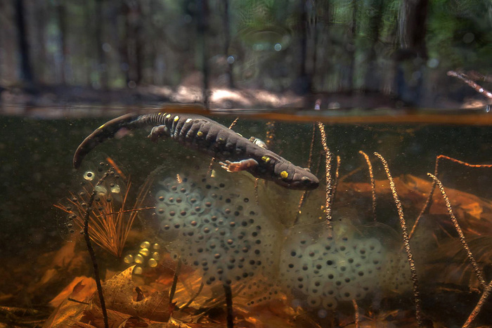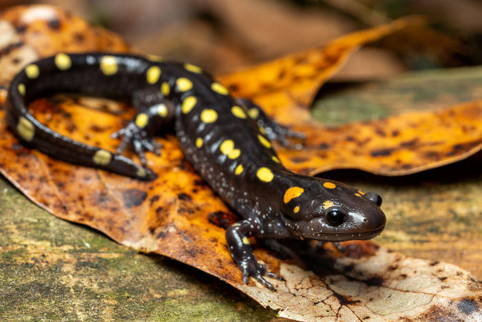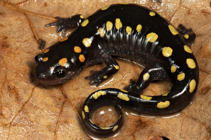 Итак, знакомьтесь – жёлтопятнистая амбистома (Ambystoma maculatum), небольшое хвостатое земноводное, родственное нашим саламандрам