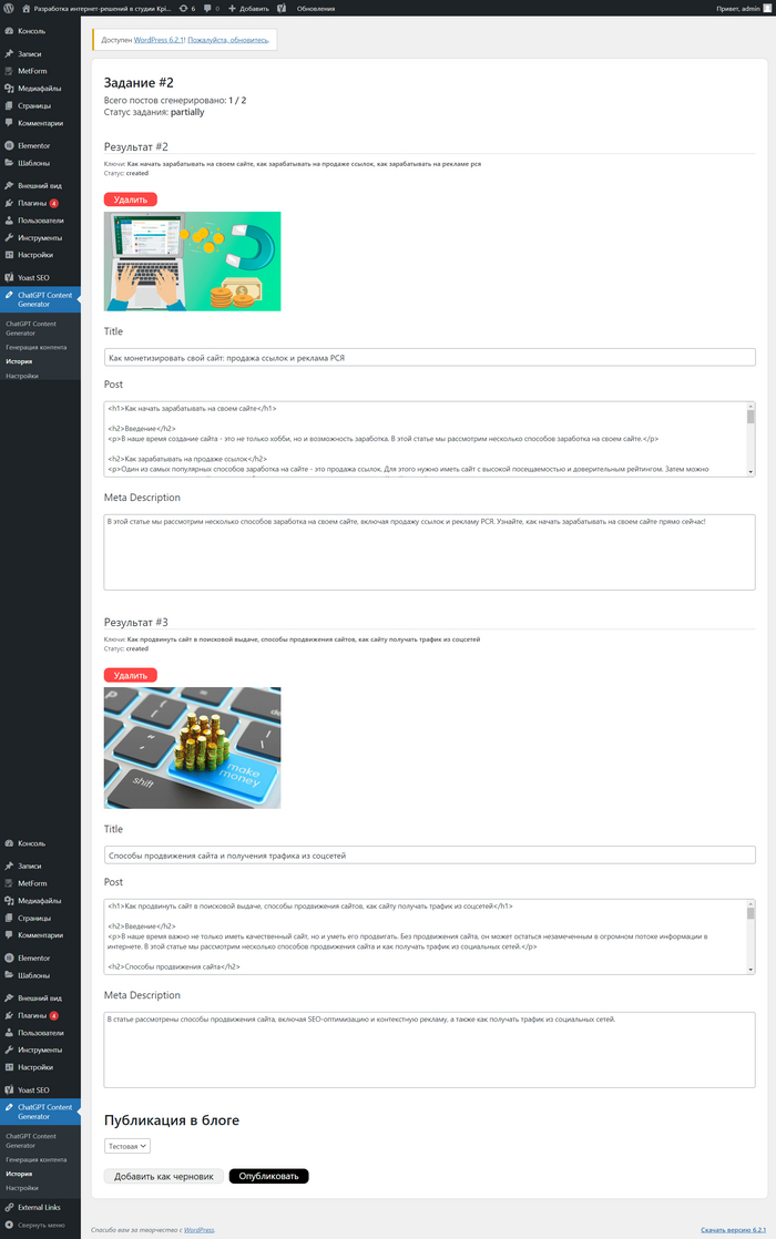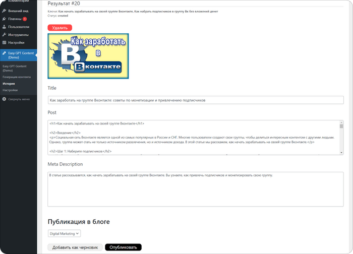 Плагин сразу заполняет Title, Description, метатеги H1 и H2. После генерации плагин предлагает проверить контент перед публикацией и внести правки, если они необходимы. Затем выбирается рубрика, и нажимается кнопочка "Опубликовать". И все готово!