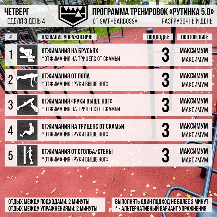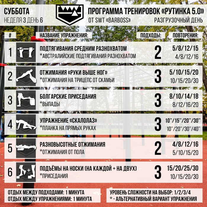 У каждого упражнения в программе есть альтернативный вариант. Иногда он менее сложный, иногда он требует другого оборудования или не требует его вовсе.