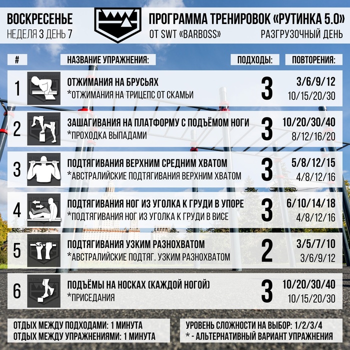 Каждое упражнение (в том числе и альтернативный вариант) имеет 4 уровня сложности. Ты можешь менять уровень сложности от упражнения к упражнению и создавать промежуточные или дополнительные уровни на своё усмотрение. Не бойся экспериментировать.