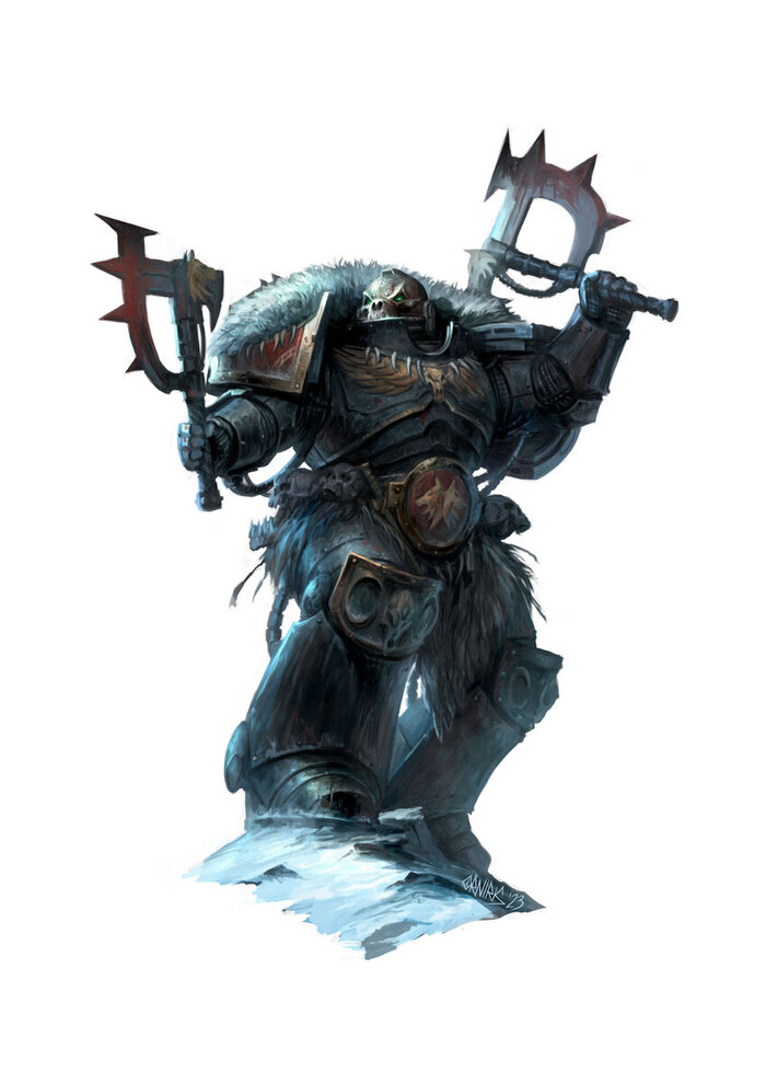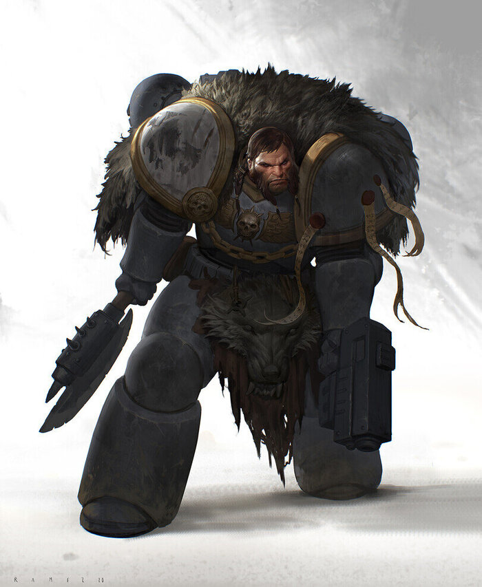 Интересно отметить, что в какой-то момент, во время очередной ритуальной дуэли, на бой вышел Космический Волк по имени Хальдор Пара Клыков. Он владел топором, который изначально принадлежал Алайошу, магистру легиона Тёмных Ангелов. На предыдущем стриме я рассказал, как оружие оказалось у Русса. Позже оно передавалось среди Волков как реликвия. И тут нельзя не привести великолепную цитату из финала «Великого Волка» Криса Райта: