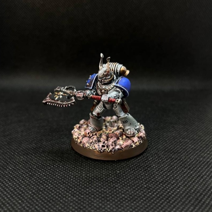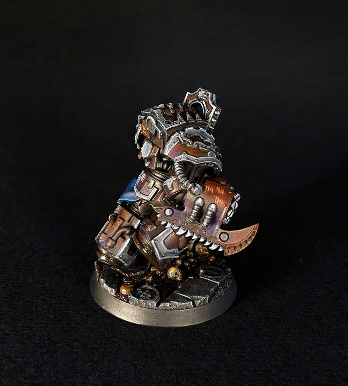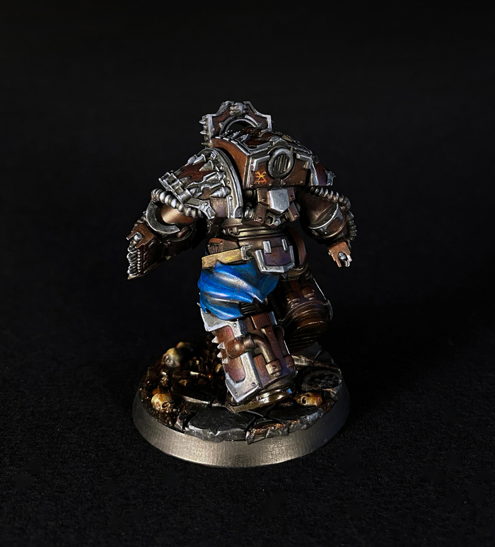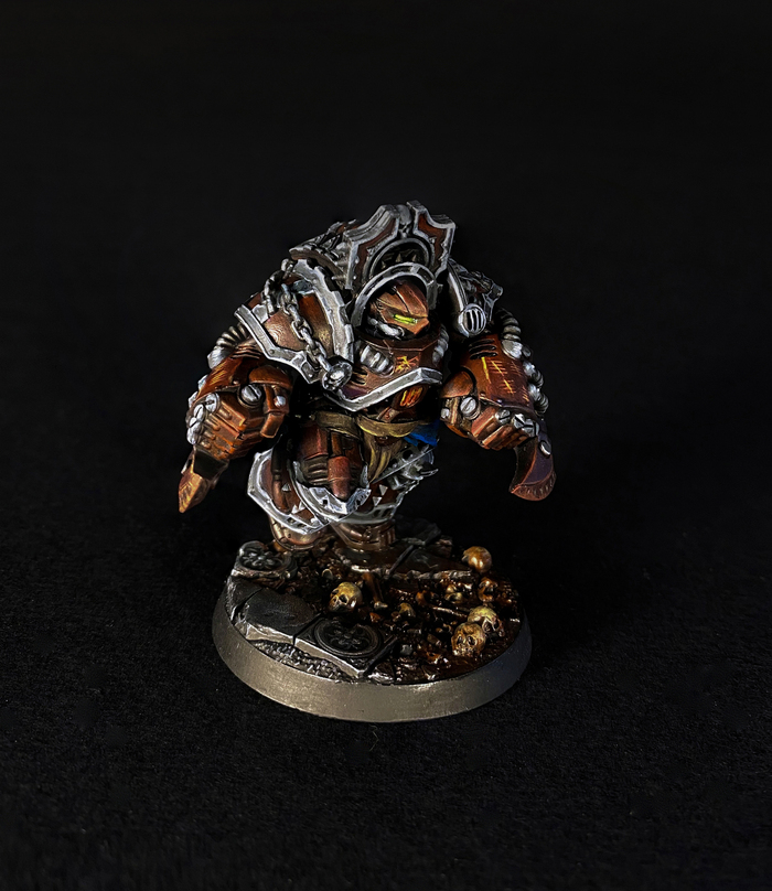 А вот пример одного из предавших легионов - Пожирателей Миров. Здесь я нашел цепной топор от другой миньки и пришлось повозиться, чтобы как-то его пристроить, чтобы было естественно. Хотя мне до сих пор поза кажется странной.