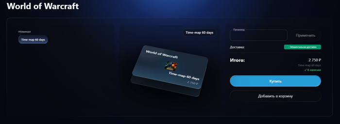Тайм карта wow 60 дней — наиболее распространённый формат для российских игроков: два месяца игрового времени за одну фиксированную оплату, сумма понятна ещё до того как нажали «world of warcraft купить».