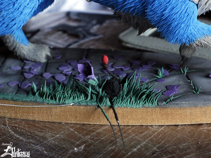 Материалы: бархатный пластик, стальная проволока, деревянная подставка, акрил, лак, стеклянные глазки.
