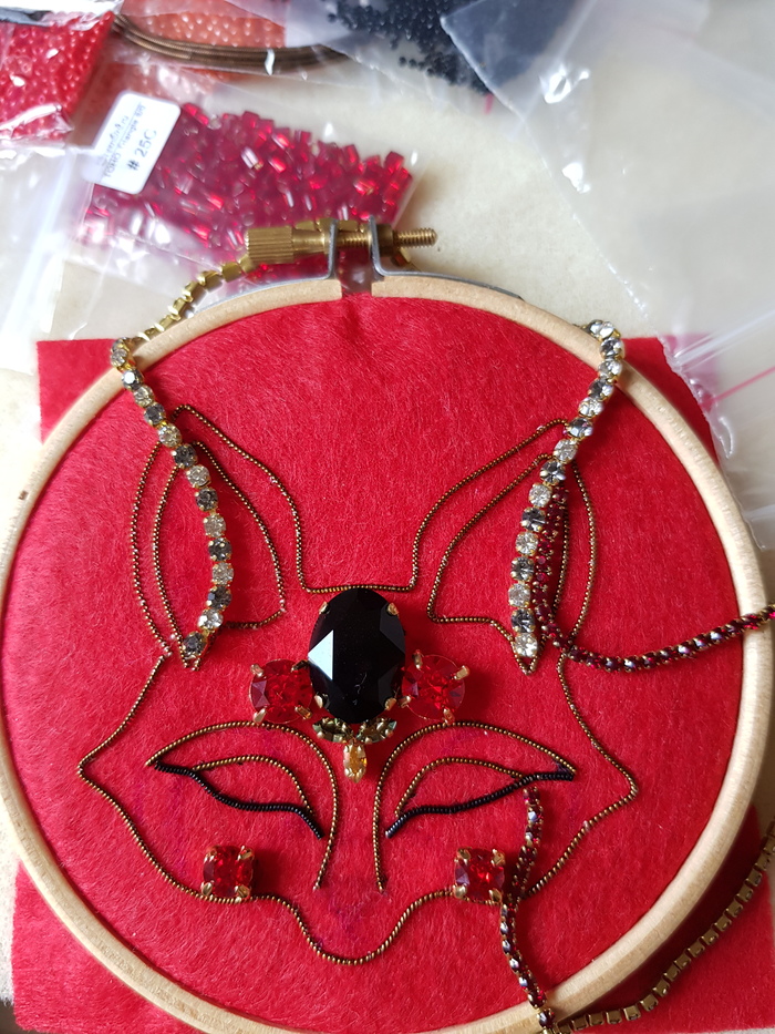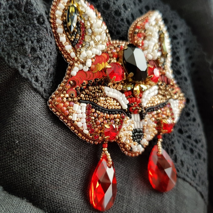 Материалы: японский бисер, чешский бисер, элементы Swarovski, фетр, канитель, трунцал, итальянские пайетки, нить S-lon, Fireline, изнанка Ultrasuede и две японские булавки