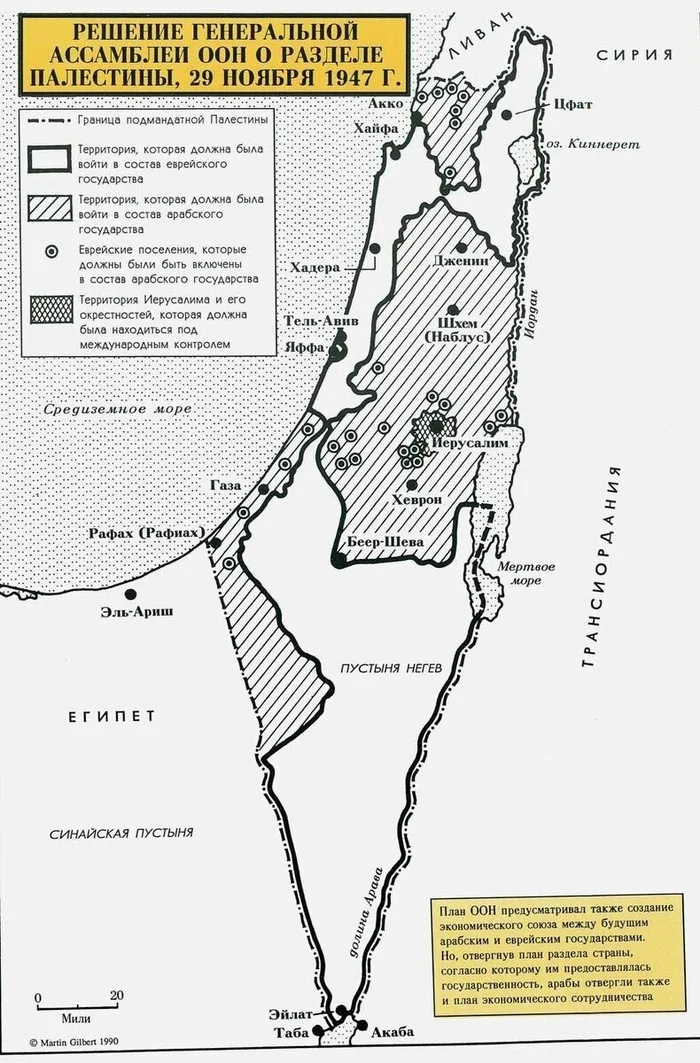 В 1947 году в соответствии с Резолюцией ООН № 181 Палестину разделили на арабскую и еврейскую части. Принятию данного решения послужило заключение Комиссии Пила о том, что британский мандат не способен продолжать свою работу в регионе, а также о необходимости упразднения колониального режима, фактически действовавшего на этой территории. Данная Комиссия занималась расследованием беспорядков во время восстания палестинцев против британских колонизаторов за национальную независимость и безопасность страны от иностранного контроля. В Резолюции ООН содержались рекомендации о создании независимых государств и присвоении городу Иерусалим особого международного статуса. К Резолюции прилагался план раздела территории.
