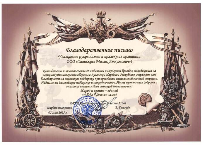 Благодарственное письмо на имя Малика Хатажаева от командования и личного состава 45-й отдельной инженерной бригады, находящейся на позициях Министерства обороны в Луганской Народной Республике, за помощь, оказанную при проведении специальной военной операции (Луганск, 2025 г.).