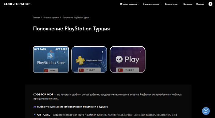 Купите подарочную карту PS Store (Турция) на надёжной цифровой площадке. Такие карты доступны на сервисах вроде Code-top — вы получаете код сразу после оплаты. Там же можно купить сразу готовый аккаунт, на вашу почту.