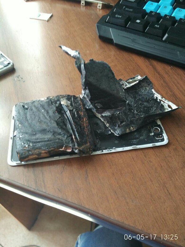 По факту телефон должен был расплавится в лепешку, однако спасая данные, а потом, осознав масштаб трагедии спасая всё от пожара, батарея была вынута вместе с задней крышкой и положена в чугунную ванну, где окончательно сдохла оставив симпатичный след.