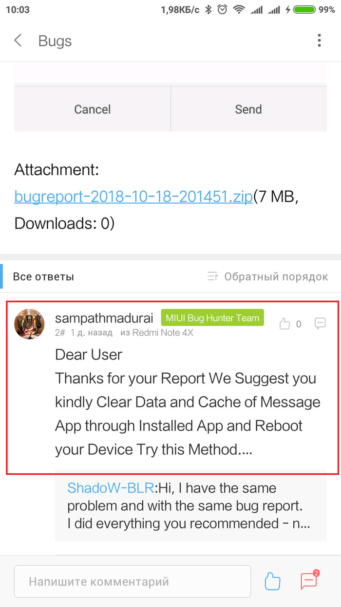 Да, у данного пользователя аппарат не такой как у меня, но ошибки-то очень даже схожи. Поразил ответ админа, причисленного к MIUI Bug Hunter Team (охотники за багами):