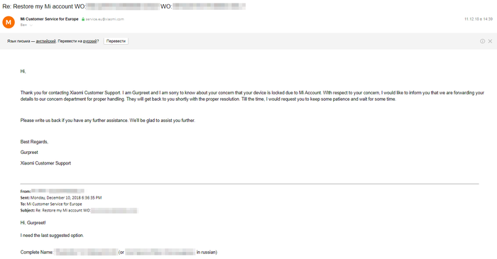 Oh shit! Пришлось связаться с бывшим владельцем телефона (Привет пап ещё раз!) . После нескольких попыток с перебиранием 3 аккаунтов выяснилось, что ни к одному из них телефон не привязан, либо аккаунты с названными данными вовсе не существовали. Соответственно, активировать его так и не получилось. Пришлось снова забросить это дело в связи с завалом на работе. Спустя небольшой промежуток времени я пишу письмо в поддержку Xiaomi, на которое получаю ответ уже на следующий день!