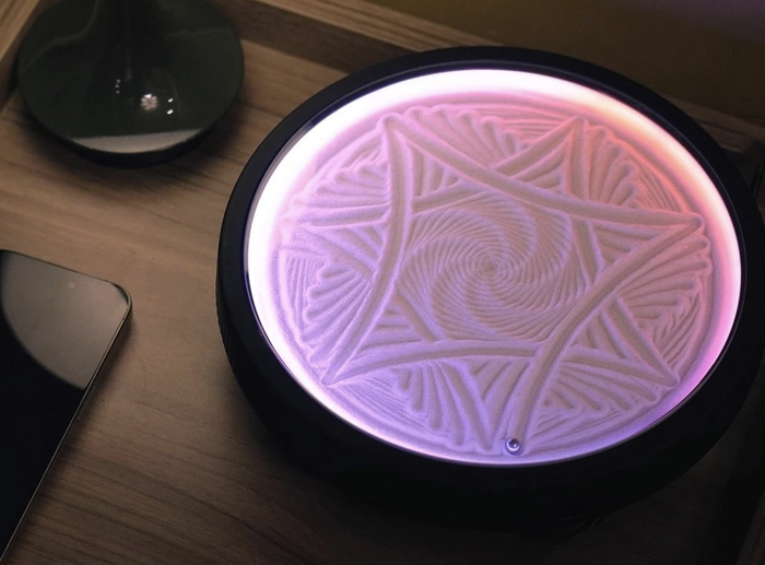 Робот создаёт завораживающие узоры на песке, превращая поверхность в постоянно меняющийся арт-объект. Принцип работы основан на магнитной тяге и точных алгоритмах движения. Устройство бесшумно и подходит как для дома, так и для офиса в качестве антистресс-элемента.