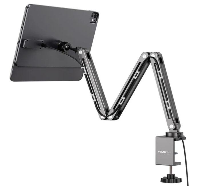 Подставка сочетает в себе держатель для планшета и мощную беспроводную зарядку. Магнитное крепление прочно фиксирует iPad, не давая ему соскользнуть даже при наклоне. Угол наклона и высота регулируются, превращая подставку в удобную станцию для работы, рисования или просмотра видео.