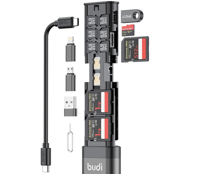 Многофункциональная коробка BUDI объединяет девять полезных инструментов, включая кабели, переходники, держатель карты SIM и аксессуары для смартфона. Компактный формат позволяет носить её в кармане или сумке, всегда имея нужные вещи под рукой. Каждый модуль надёжно фиксируется внутри корпуса и защищён от повреждений.