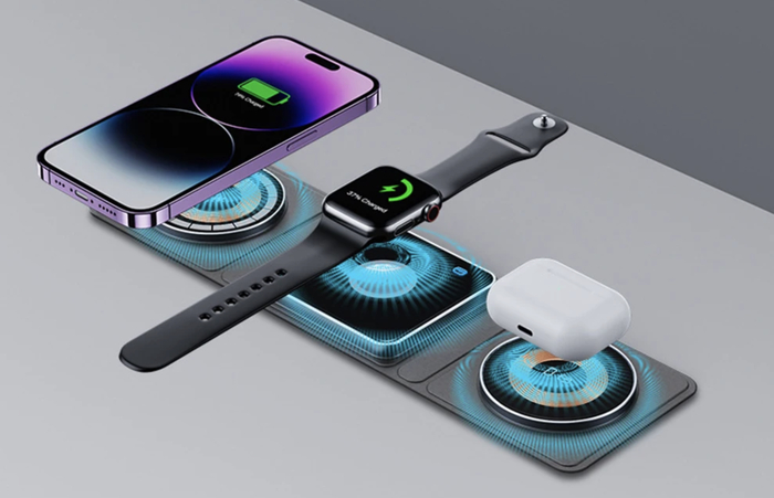 Зарядная станция поддерживает iPhone, Apple Watch и AirPods одновременно. Механизм складывания делает устройство идеальным для поездок. Магнитное крепление фиксирует смартфон на месте, обеспечивая стабильную зарядку.