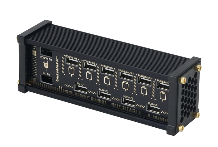 На передней панели расположены десять полноразмерных USB-A портов, каждый из которых активируется отдельным механизмом тумблерного типа. Щелчок при переключении создаёт приятную тактильность и позволяет мгновенно отключать ненужные устройства, поддерживая порядок среди подключённых гаджетов.
