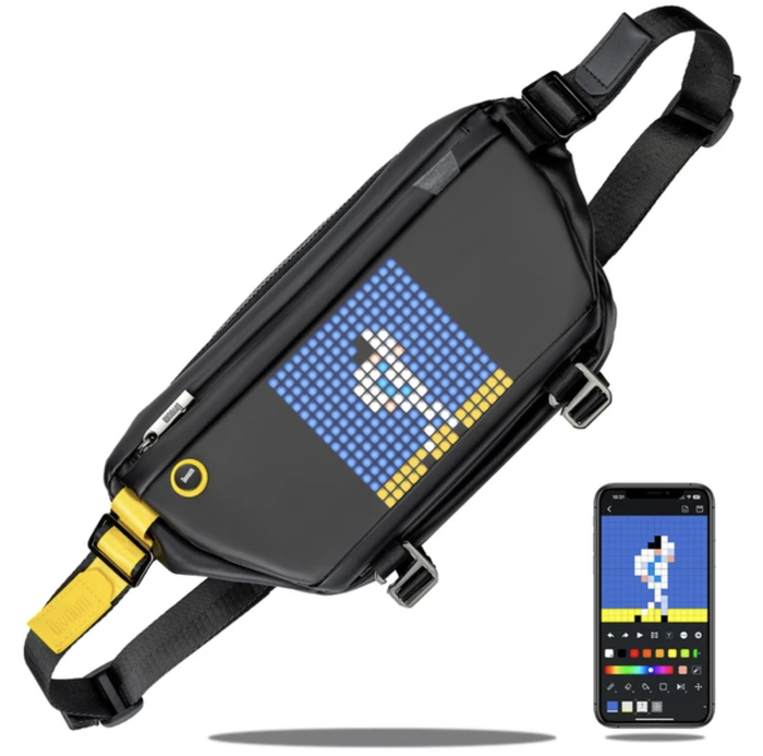 Сумка выделяется ярким LED-дисплеем на передней панели, который оживляет аксессуар анимациями, пиксельными картинками и короткими надписями. Панель настраивается через приложение, где можно загружать свои изображения, менять стиль отображения или переключать режимы под настроение. Такой элемент превращает сумку в креативный аксессуар, позволяющий выделяться в толпе.