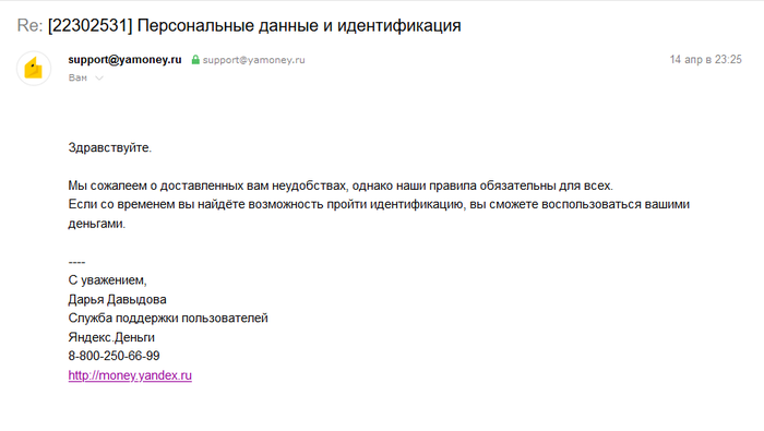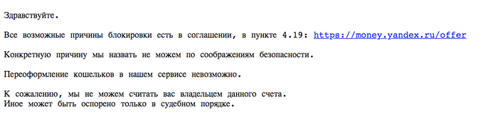 4. Если человек окажется умнее табуретки, но всё таки не будет иметь достаточных оснований, чтобы пойти в прокуратуру, он пойдет плакаться Яндексу. Ответ там заведомо известен "Сам лох, мы будем что то делать после пинка прокуратуры". Если он ещё более умнее, чем табуретка, то он позвонит в банк и его карту заморозят, на всякий случай и всё. А если ещё более умный, то напишет даже на хостинг, где расположен сайт и где ему ответят, что сам лох и у нас в правилах как и у Яндекса всё прописано, что мы не обязаны ничего проверять.