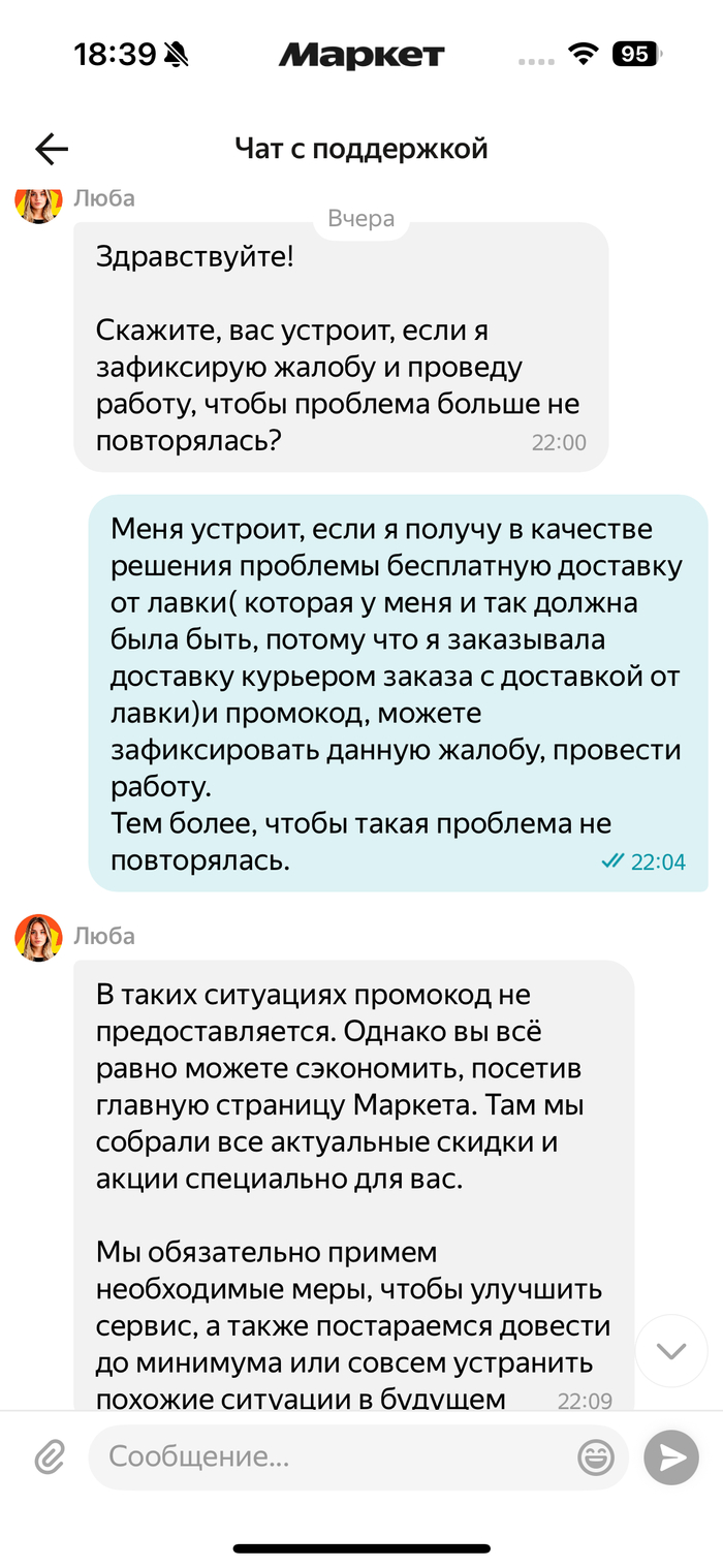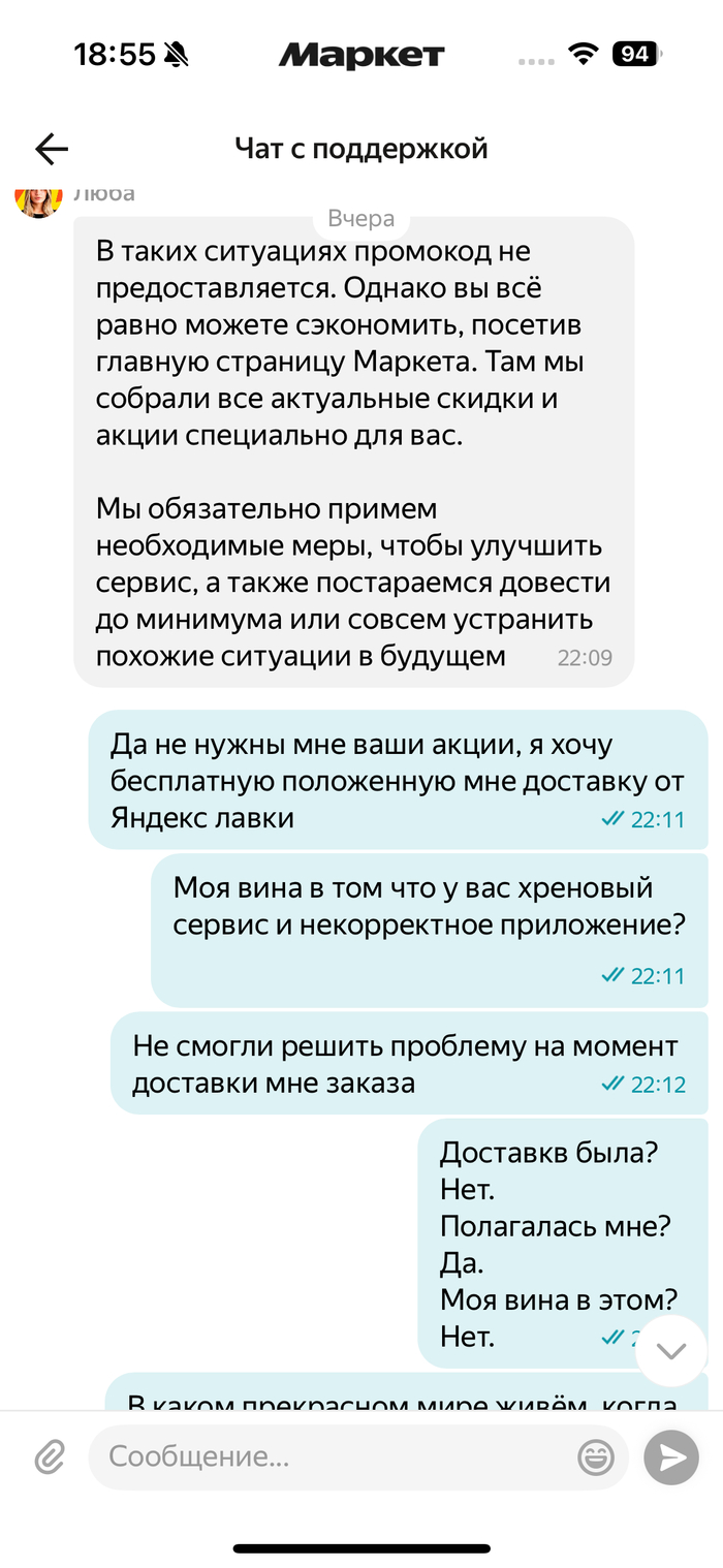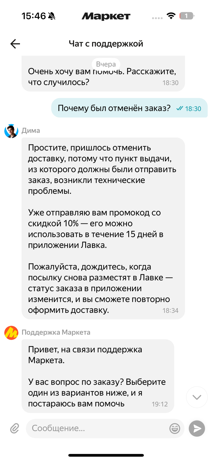 Тут я была возмущена, а правда, какого лешего они отменяют хотя бы доставку Лавки, то что курьер не смог получить заказ из маркета, не означает, что заказ из лавки то я не жду.